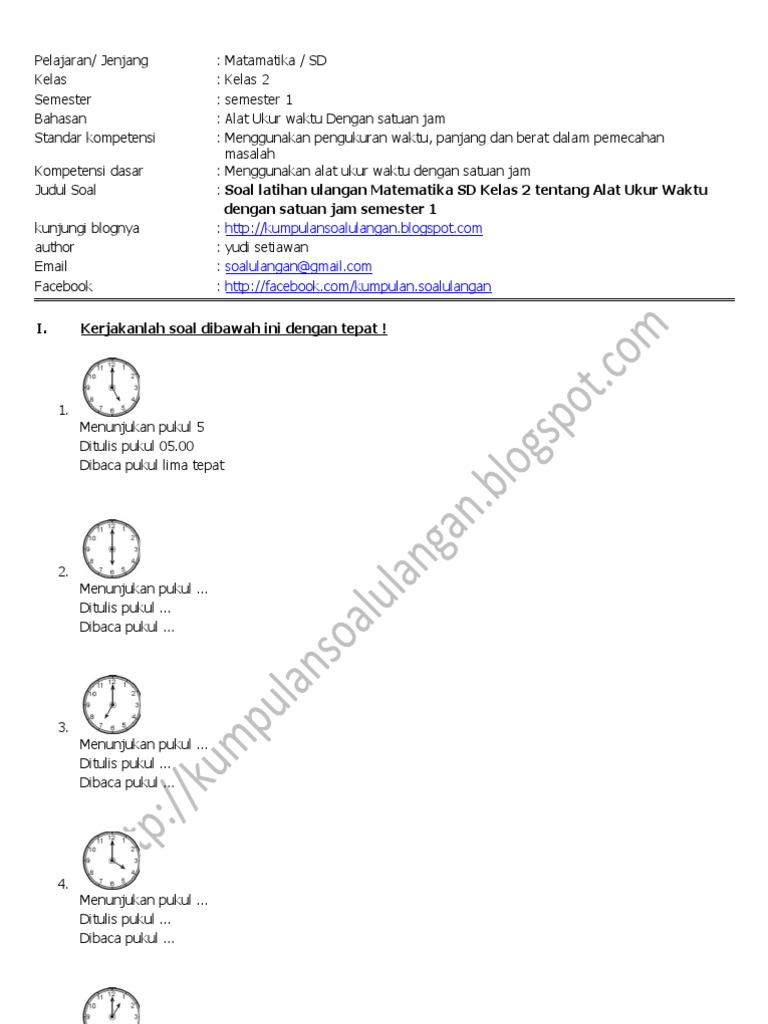 untuk "Materi Satuan Waktu Kelas 2 Sd - Soal Matematika Kelas 2 Sd Materi Jam : Menggunakan pengukuran waktu, panjang dan berat dalam pemecahan masalah."